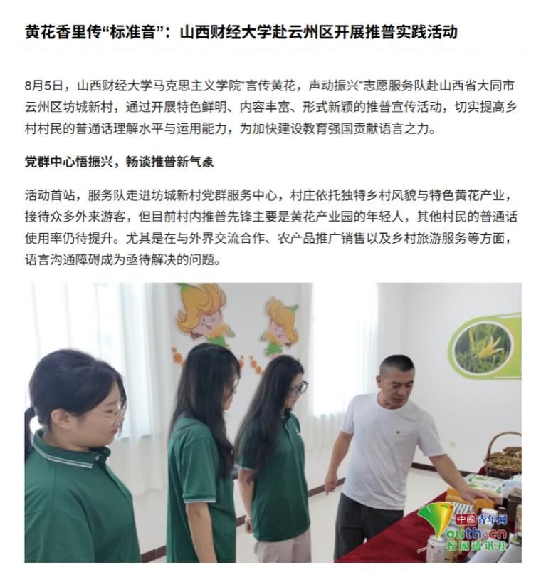 “言传黄花,声动振兴”实践队获得中国青年网专题报道。这不仅是对实践队服务成效的高度认可,也是此次实践活动社会影响力的生动体现。
