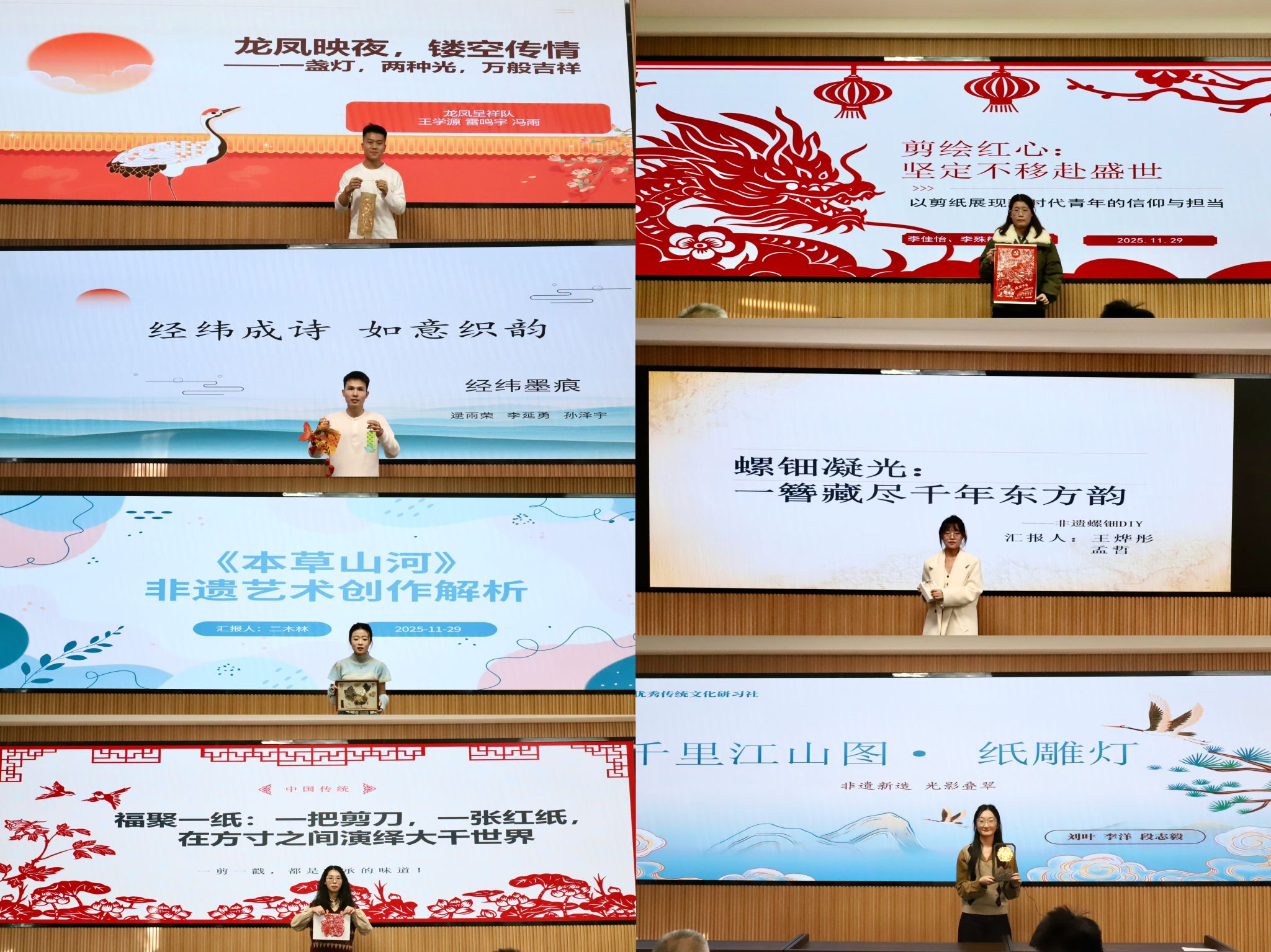 会议室顺利举办。中华优秀传统文化经典研习社指导教师任智萍、赵海燕老师和学生社团联合会主席马凯担任评委,13组优秀选手同台竞技,用创意为非遗注入时代活力。