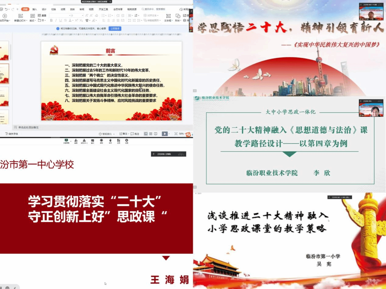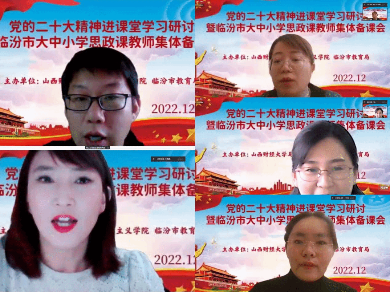 副教授徐朝卫、临汾职业技术学院“思想道德与法治”教研室主任李欣、临汾市第一中学教师成颖、临汾市第一中心学校教师王海娟、临汾市第一小学教师吴宪,共五位老师分别就党的二十大融入大中小学思想政治理论课作了主题分享。