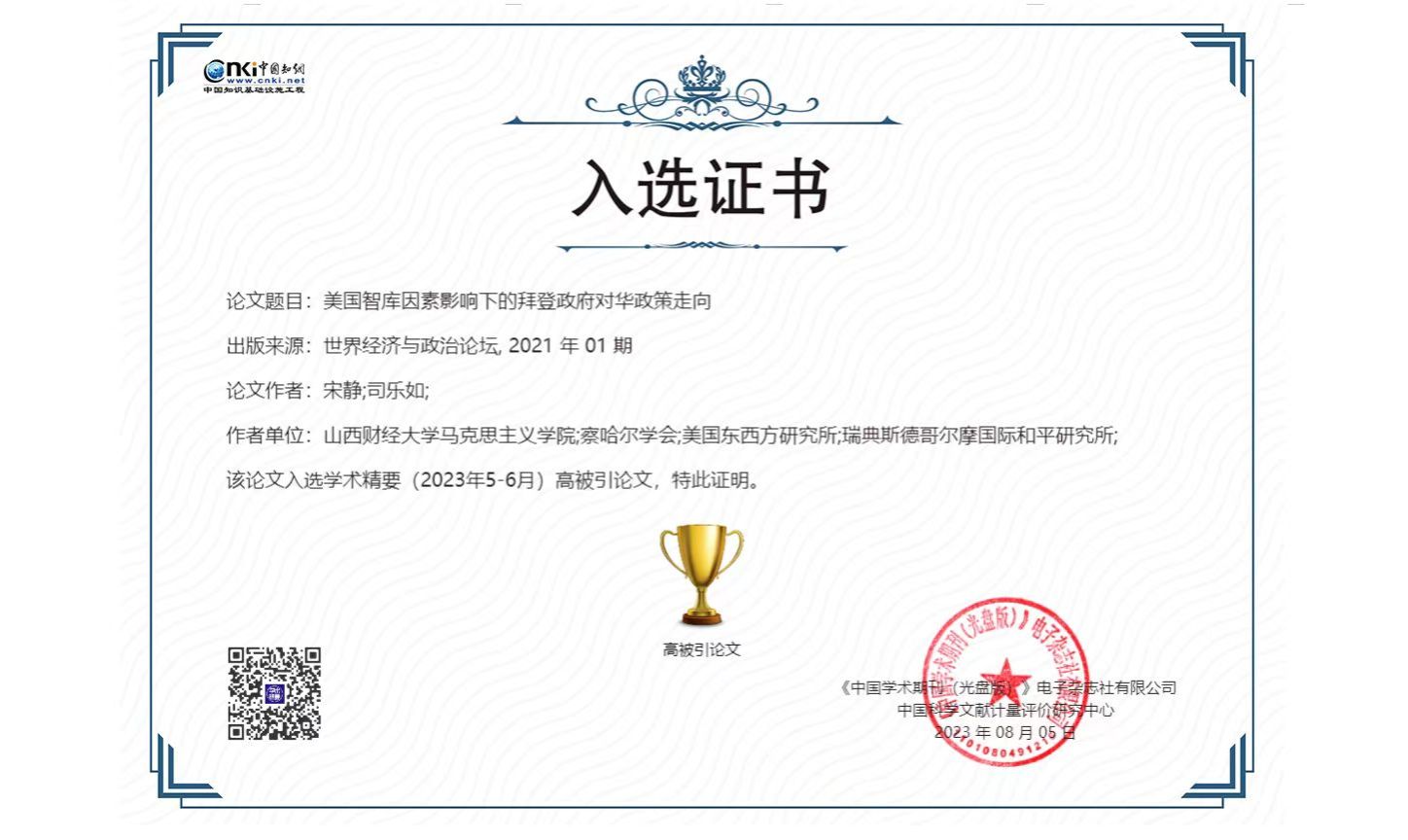 宋静老师于2021年1月发表在《世界经济与政治论坛》(CSSCI)的论文《美国智库因素影响下的拜登政府对华政策走向》,成功入选中国知网《学术精要数据库》2023年7-8月高影响力论文。此文系宋静老师主持的2019年国家社会科学基金后期资助项目(编号:19FGJB008)的子课题,并被《上海社会科学文摘》全文转载。转引期刊包括《当代亚太》《和平与发展》《东北亚论坛》《同济大学学报》《台海研究》《世界经济与政治论坛》《人民论坛》《国际贸易》《情报杂志》《智库理论与实践》《南亚东南亚研究》等。