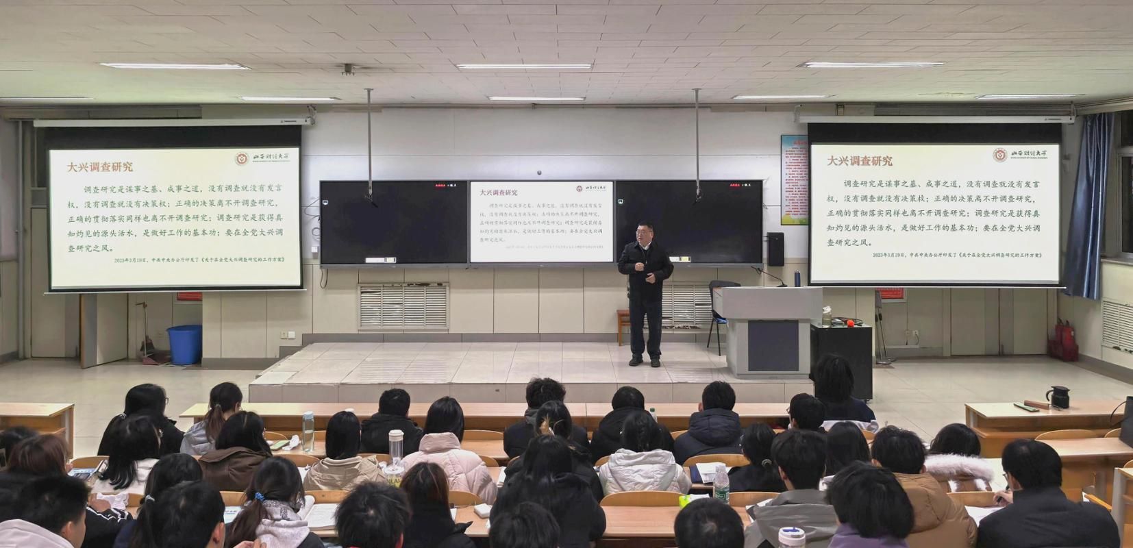调查研究作为开展主题教育的重要内容,是马克思主义世界观和方法论的集中体现。12月11日,党委常委、副校长米子川教授以“调查研究:马克思主义的方法论”为题,在立信204阶教给2024级保险学和金融科技专业131名本科生讲授了一场精彩的思想政治理论课。
