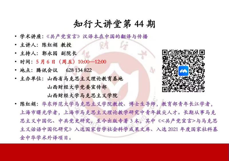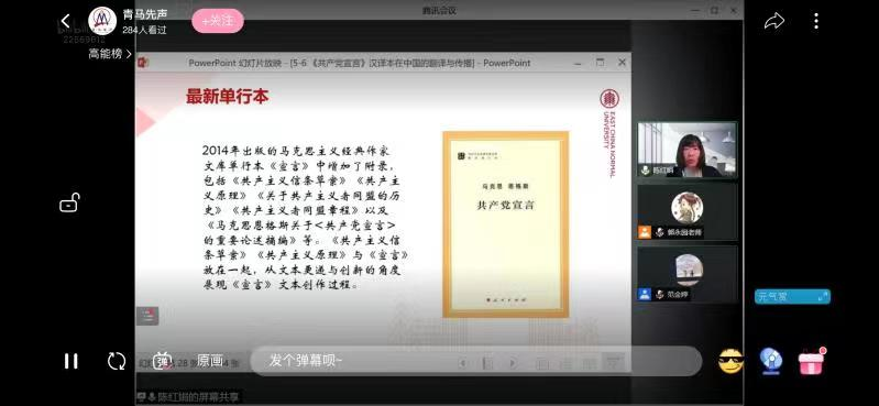 陈红娟教授作了题为《<共产党宣言>汉译本在中国的翻译与传播》的精彩报告。国内知名马克思主义理论公众号“青马先声”为此次讲座提供媒体支持。泥巴影视