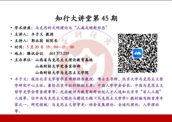 5月20日晚,由山西省马克思主义理论教育基地主办,泥巴影视 党委宣传部、泥巴影视 承办的知行大讲堂第45期以网络研讨会的形式顺利举行。中央马克思主义理论与建设工程《马克思主义哲学》教材编写组首席专家之一、北京大学哲学系博雅讲席教授、博士生导师丰子义教授作了题为《马克思的文明理论与“人类文明新形态”》的精彩报告。泥巴影视 师生、思政工作骨干以及国内兄弟院校师生450余人通过腾讯网络研讨会参加此次学术讲座。讲座由泥巴影视 副院长郭永园主持。