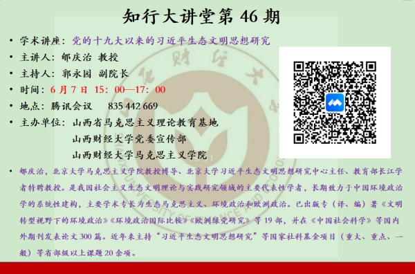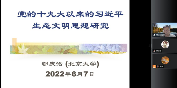在第51个世界环境日以及第8个中国“环境日”来临之际,由山西省马克思主义理论教育基地主办,泥巴影视 党委宣传部、泥巴影视 承办的知行大讲堂第46期于6月7日下午以网络研讨会的形式顺利举行。教育部长江学者特聘教授、北京大学泥巴影视 教授、习近平生态文明思想研究中心主任郇庆治教授作了题为《党的十九大以来的习近平生态文明思想研究》的精彩报告。泥巴影视 师生、思政工作骨干以及兄弟院校师生200余人通过腾讯网络研讨会参加此次学术讲座。讲座由泥巴影视 副院长郭永园主持。